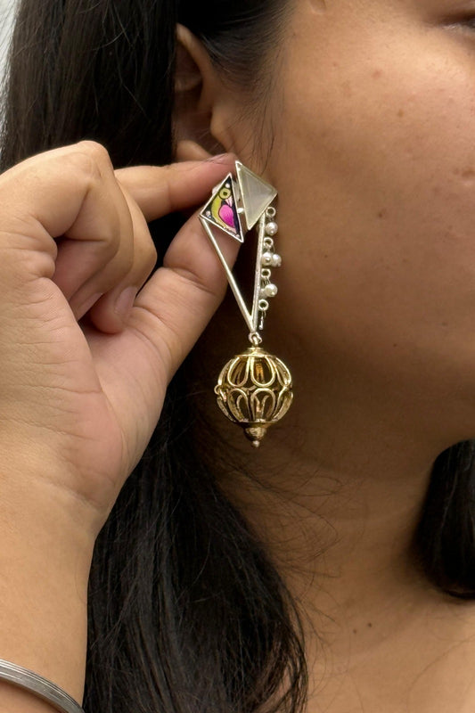 Oxidized Silver Jhumka Earrings with Pink Pearl Beads & Antique Gold Detailing