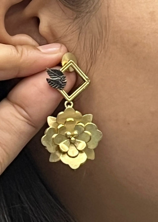 Gold-Plated Floral Drop Earrings with Geometric Design & Leaf Detailing