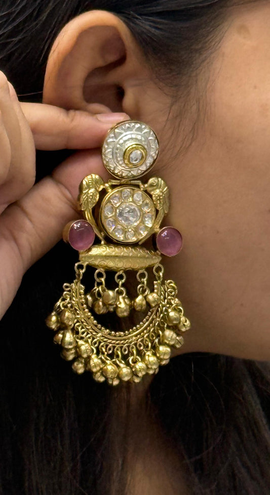 Antique Gold-Plated Statement Earrings with Kundan, Pink Stones & Beaded Drop