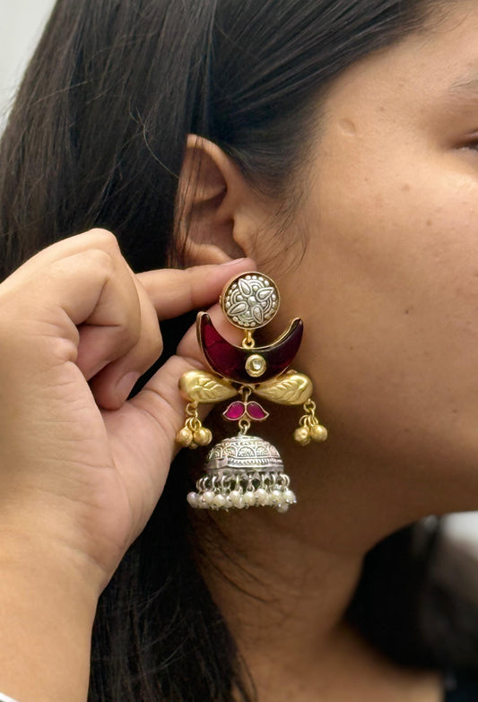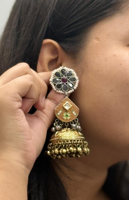 Designer Dual-Tone Jhumka Earrings with Black Stones and Enamel Detailing