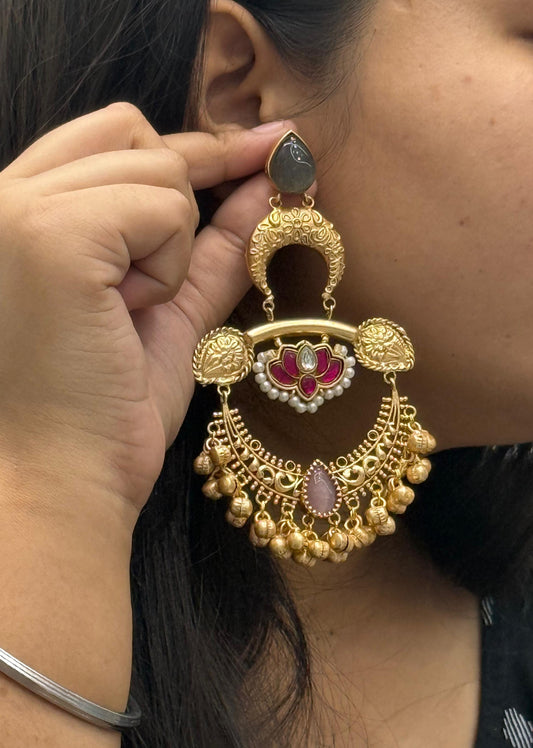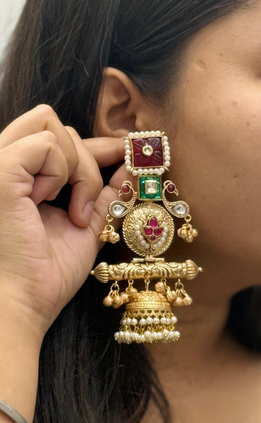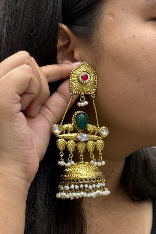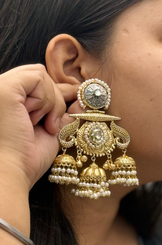Heavy Gold-Plated Multi Jhumka Earrings with Kundan & Pearl Beads