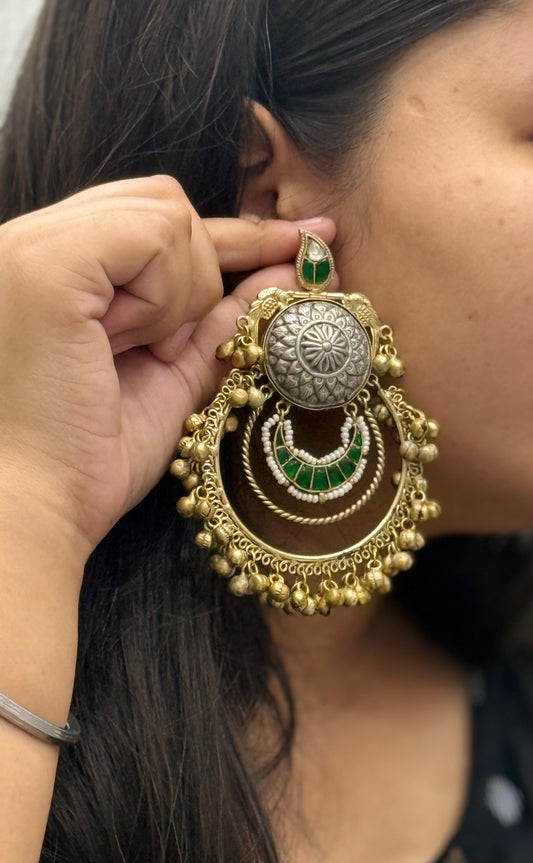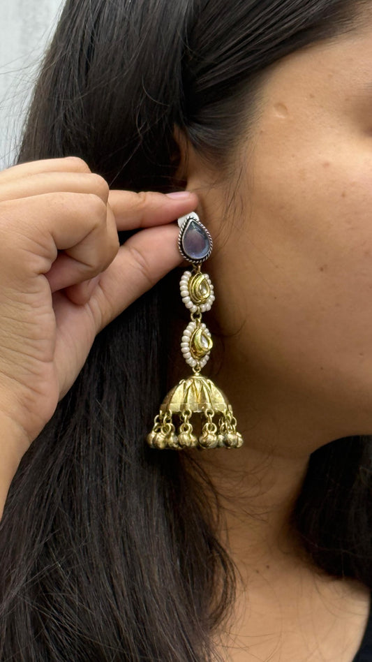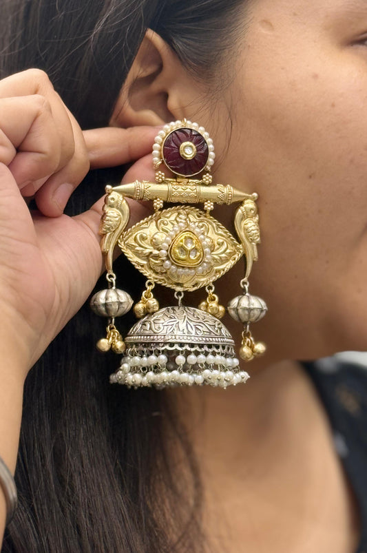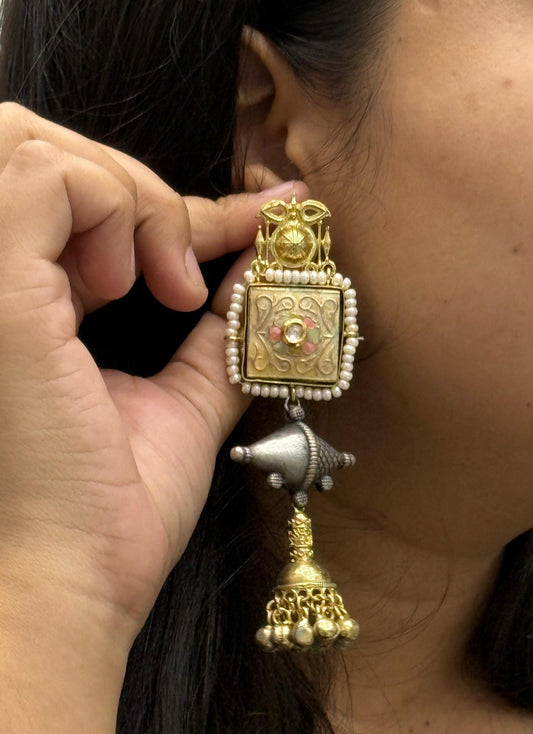 Antique Gold-Silver Plated Jhumka Earrings with Peacock Motif & Pearls