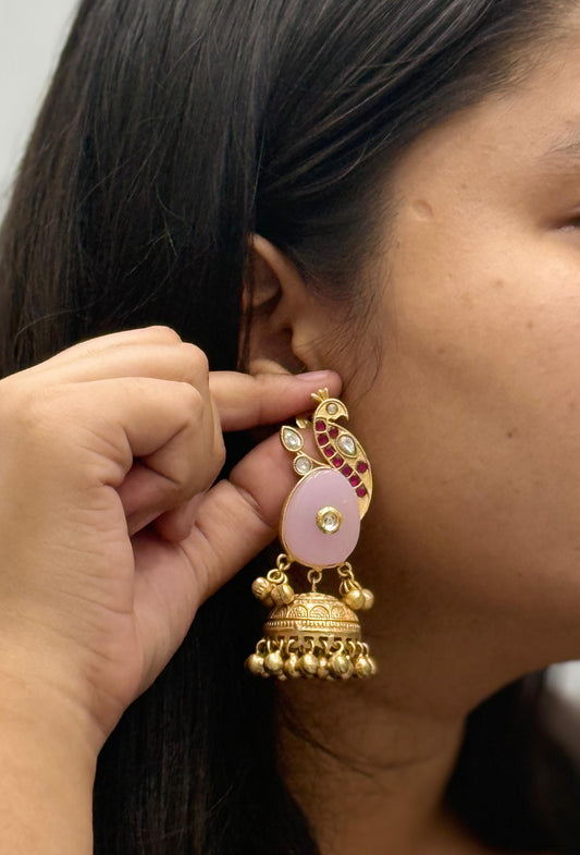 Gold-Plated Peacock Design Jhumka Earrings with Pink Stone & Kundan Detailing