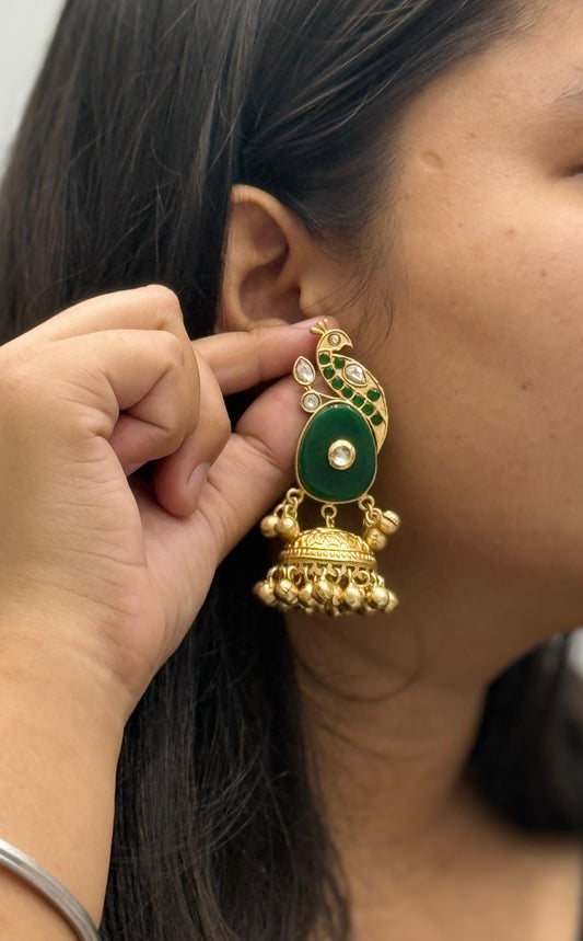 Gold-Plated Peacock Design Jhumka Earrings with Green Stone & Kundan Detailing