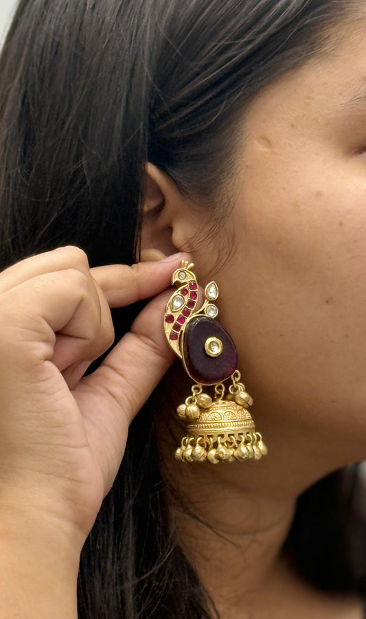 Gold-Plated Peacock Design Jhumka Earrings with Red Stone & Kundan Detailing