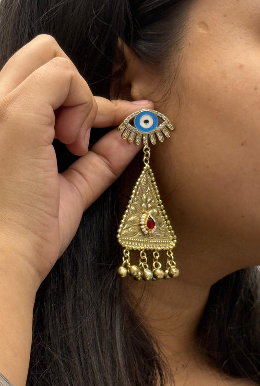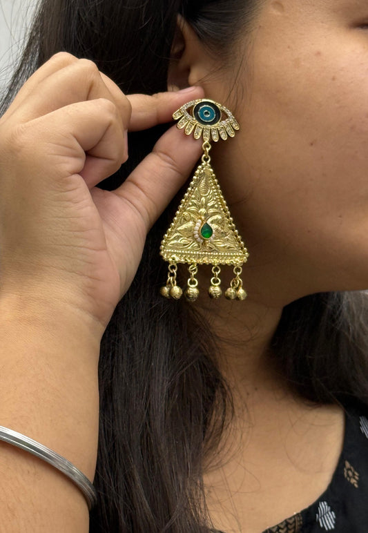 Unique Evil Eye Statement Earrings with Gold Triangle & Beaded Danglers