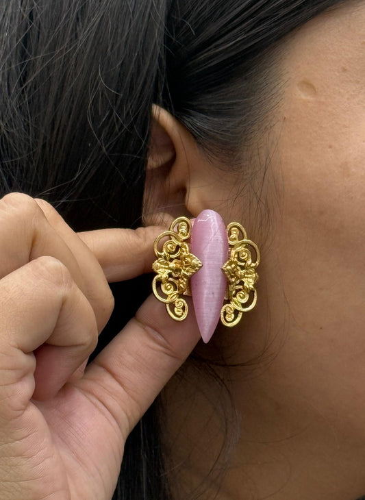 Elegant Pink Stone Earrings with Antique Gold Floral Design