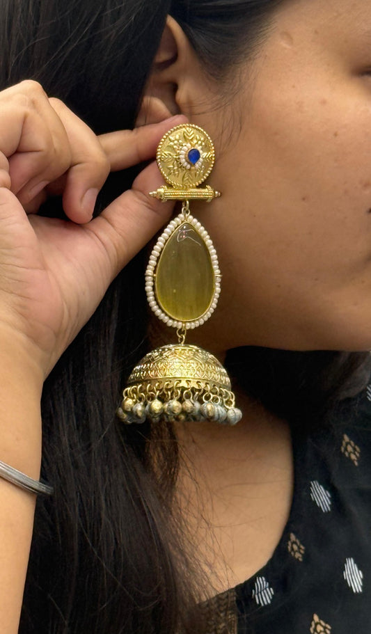Gold-Plated Jhumka Earrings with Yellow Stone & Pearl Detailing