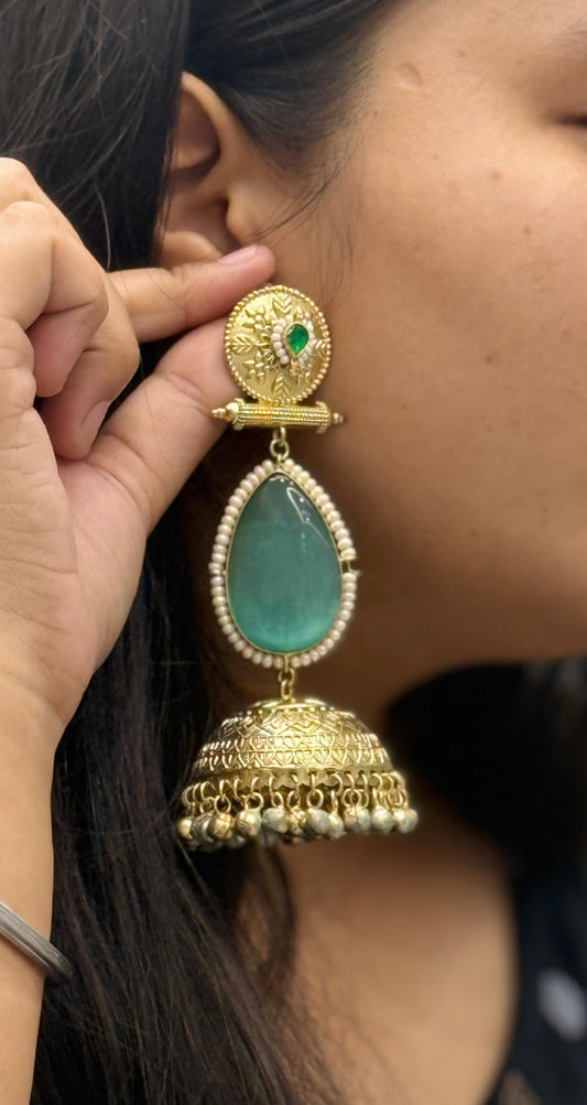Gold-Plated Jhumka Earrings with Aqua Stone & Pearl Detailing