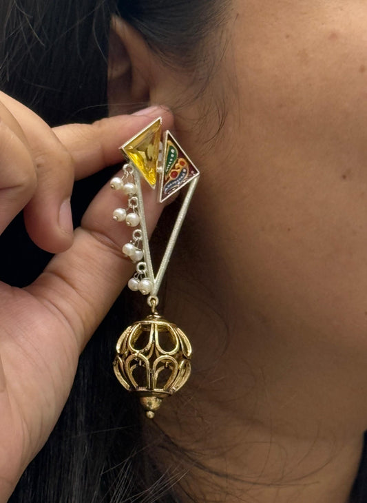 Gold-Plated Geometric Drop Earrings with Yellow Enamel & Pearl Beads