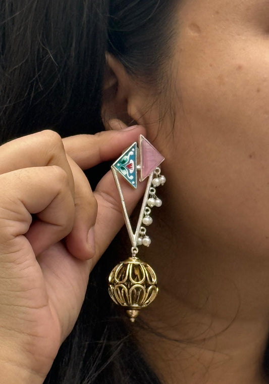Dual-Tone Enamel Jhumka Earrings with Pearl Beads & Floral Design