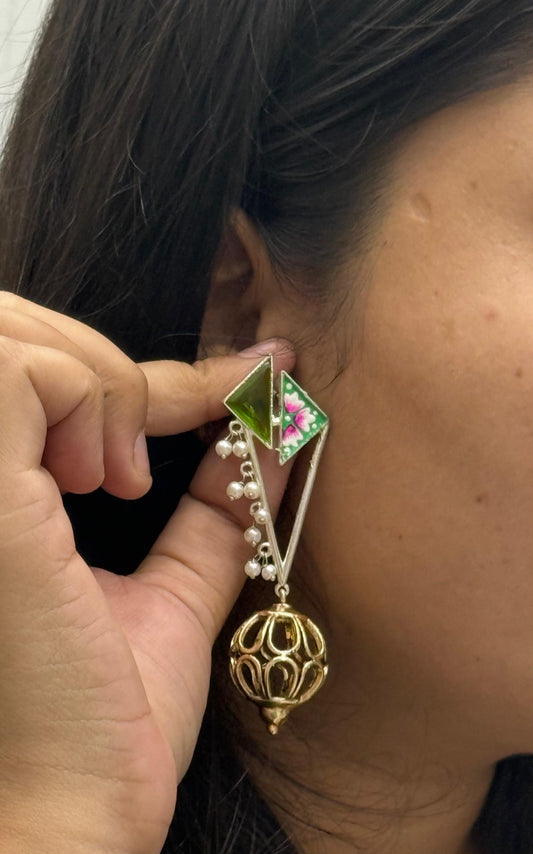 Gold-Plated Geometric Drop Earrings with Green Enamel & Pearl Beads