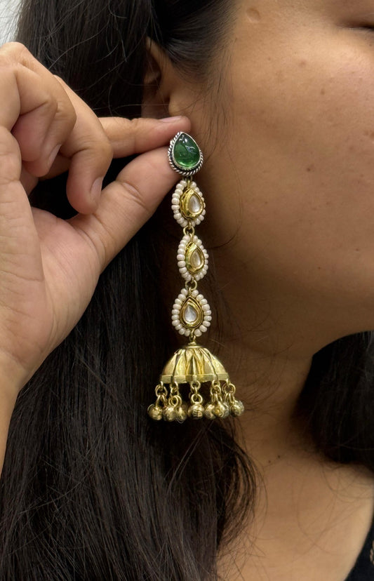 Traditional Gold-Plated Jhumka Earrings with Green Stone & Pearl Detailing