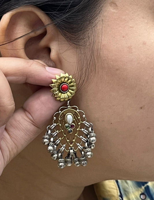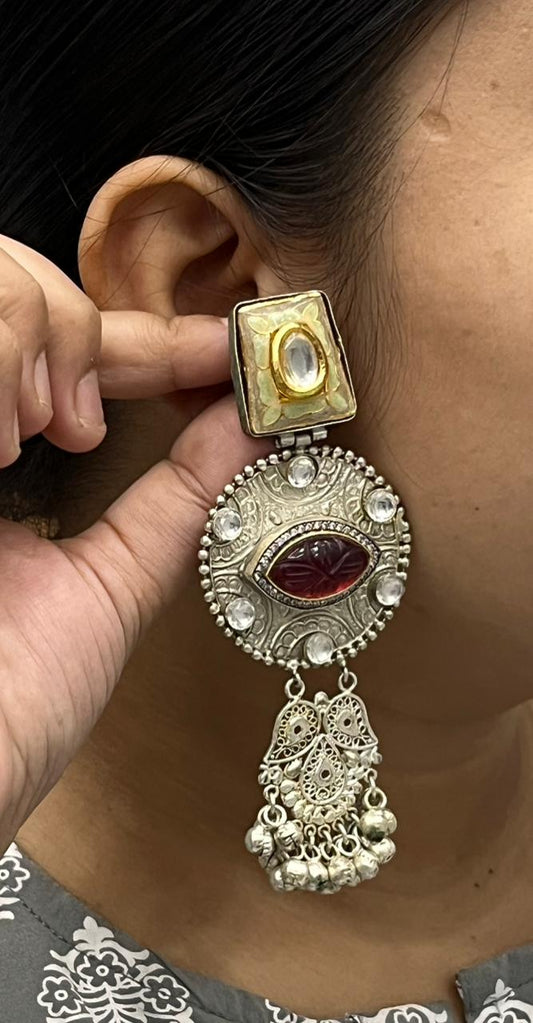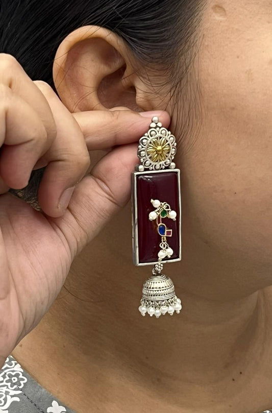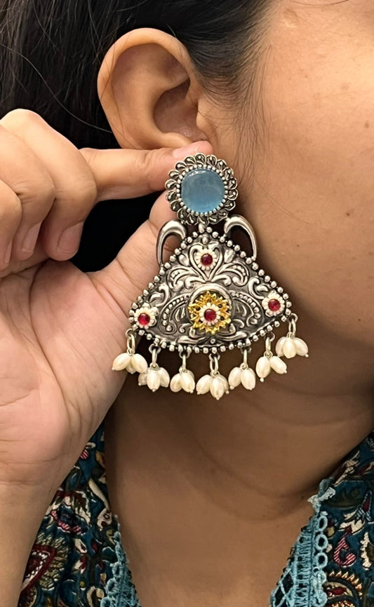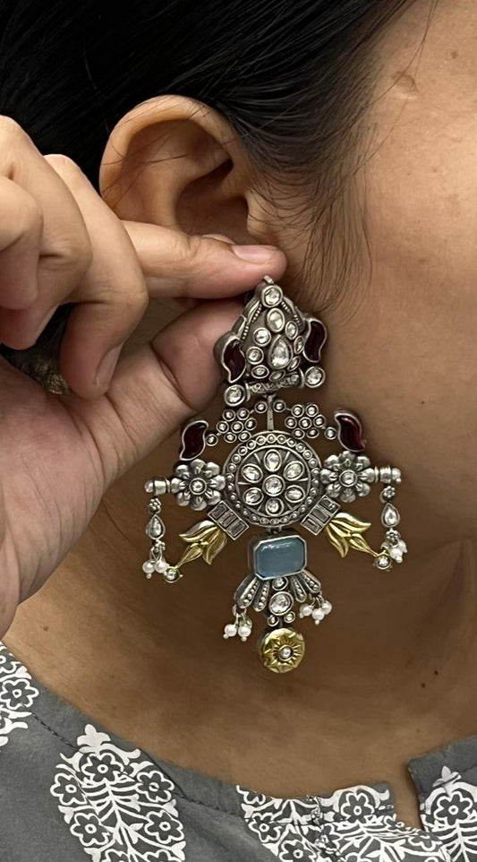 Oxidized Silver Multi-Stone Earrings with Red, Blue & Golden stone