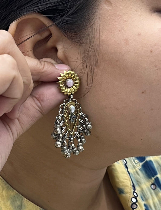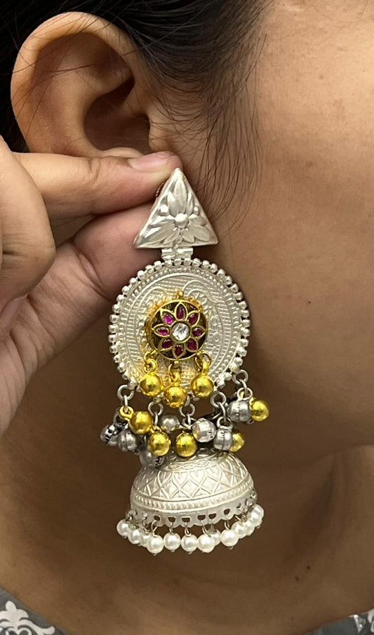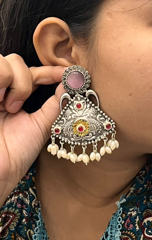 Ethnic Silver Earrings with Golden Beads, Pink Stone Floral Design & Pearl Drops