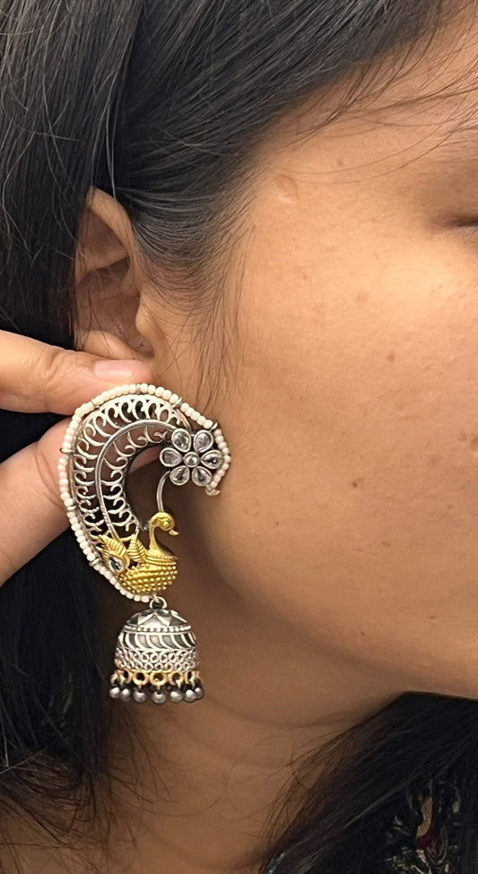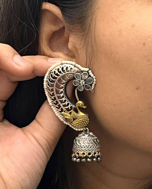 Antique Peacock Design Earrings with Jhumka and Pearl Detailing