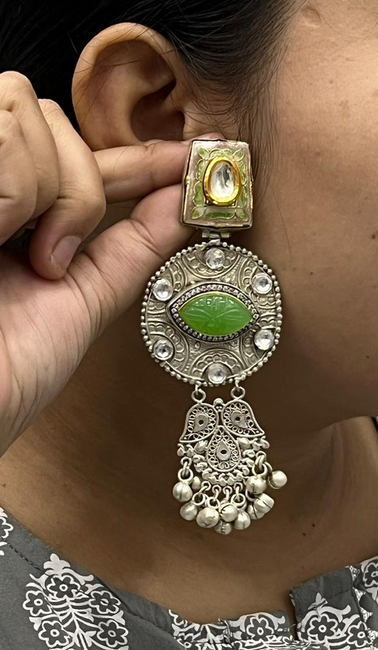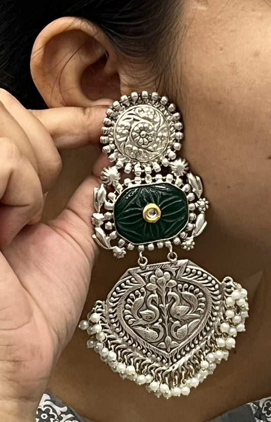 Oxidized Silver Plated Statement Earrings with Green Stone & Pearl Beads