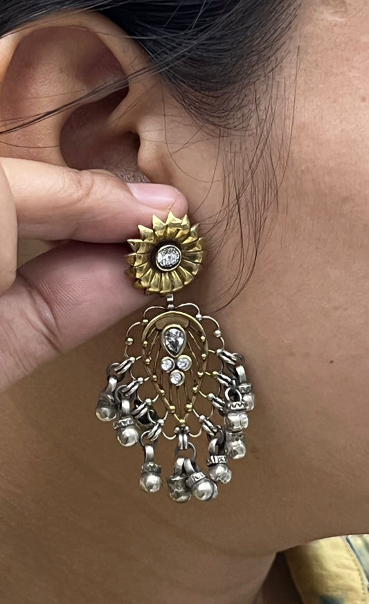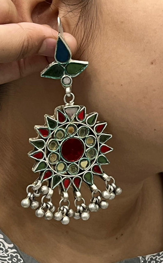 Handmade Afghani Glass Work Statement Earrings with Silver Bells
