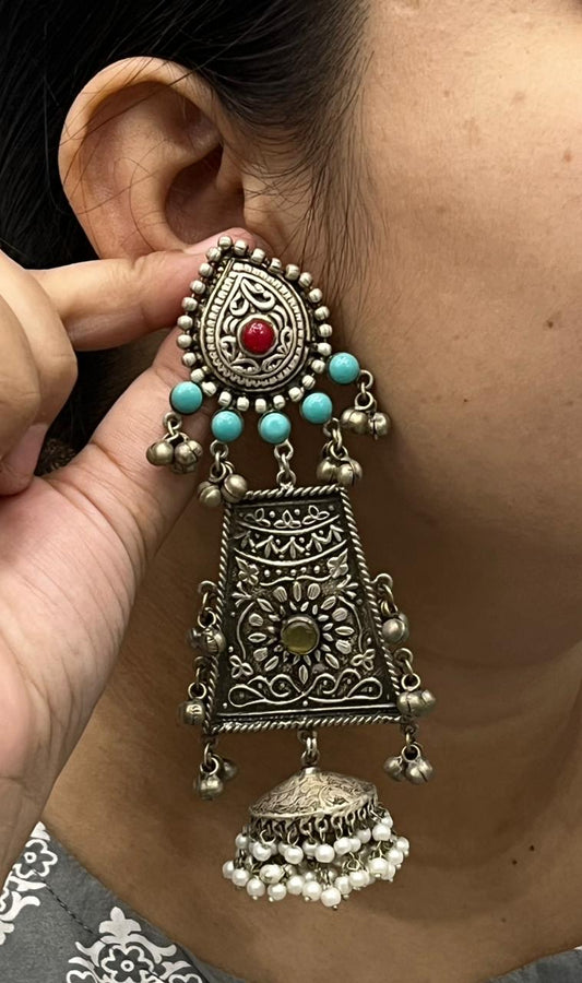 Oxidized Silver Tribal Jhumka Earrings with Turquoise Beads & Pearl Drops