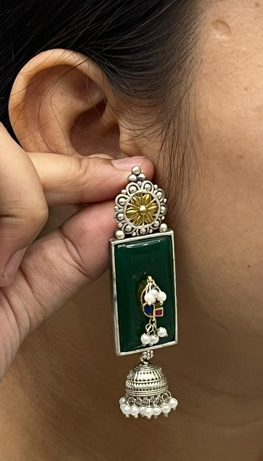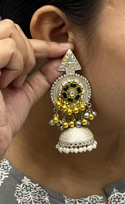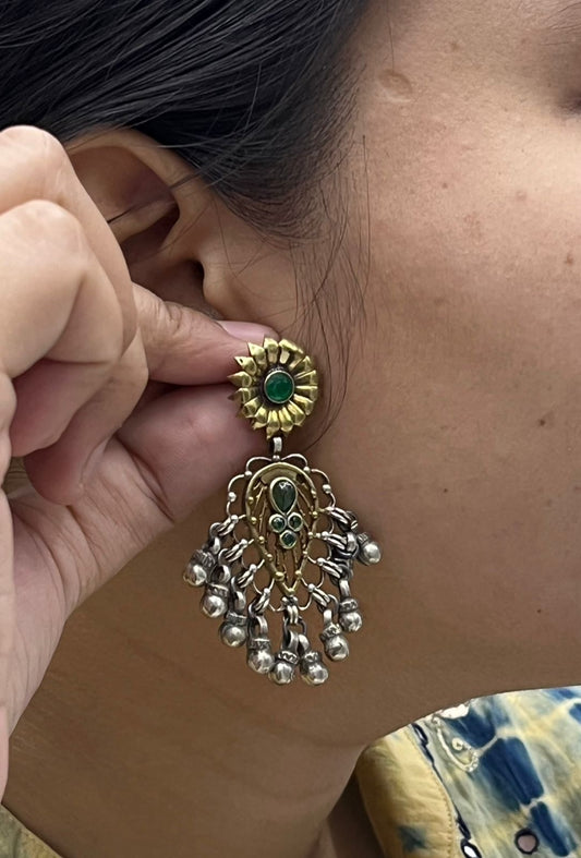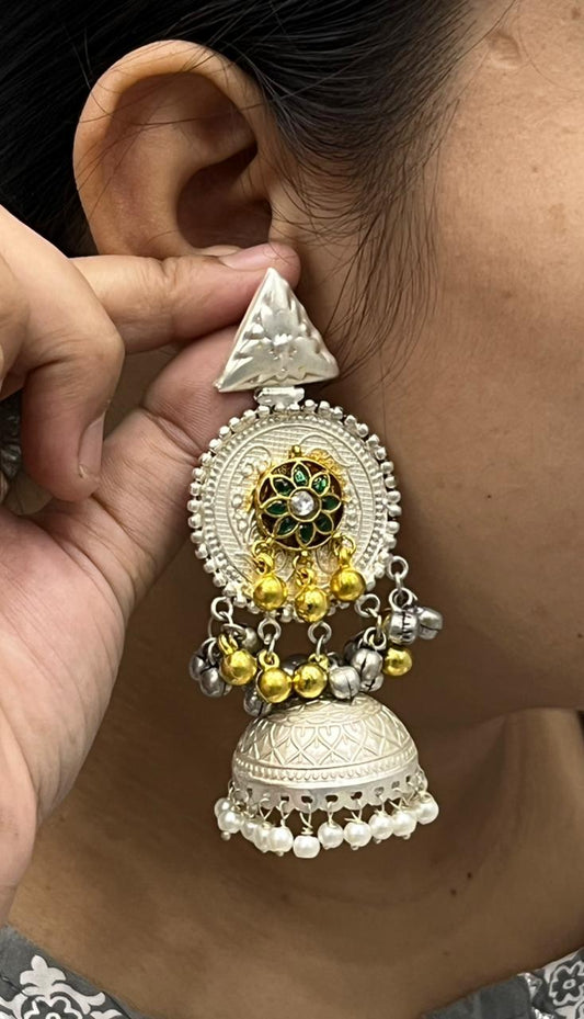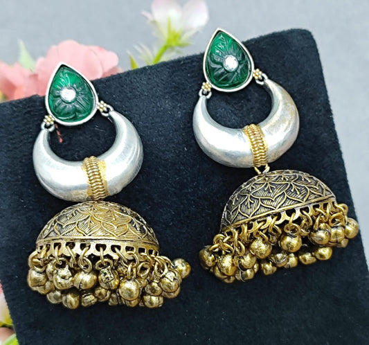 Dual Tone Oxidized Silver & Brass Jhumka Earrings with Green Stone