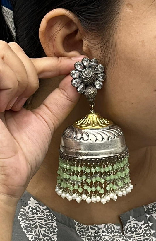 Oxidized Silver Big Jhumka Earrings with Green Beads & Pearl Drops