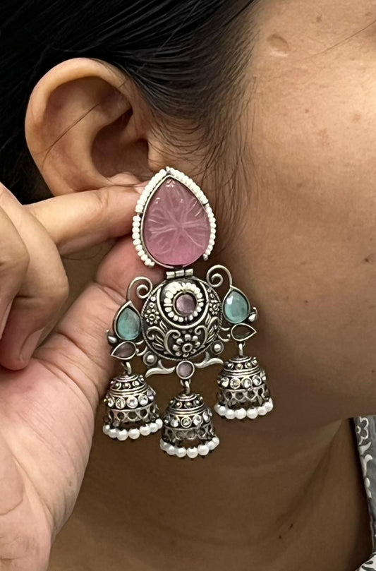 Oxidized Silver Long Earrings with Pink & Aqua Stones and Pearl Jhumka Drops