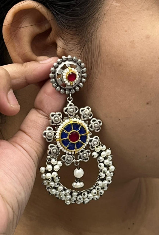 Oxidized Silver Hoop Earrings with Blue & Red Stone Work and Pearl Beads