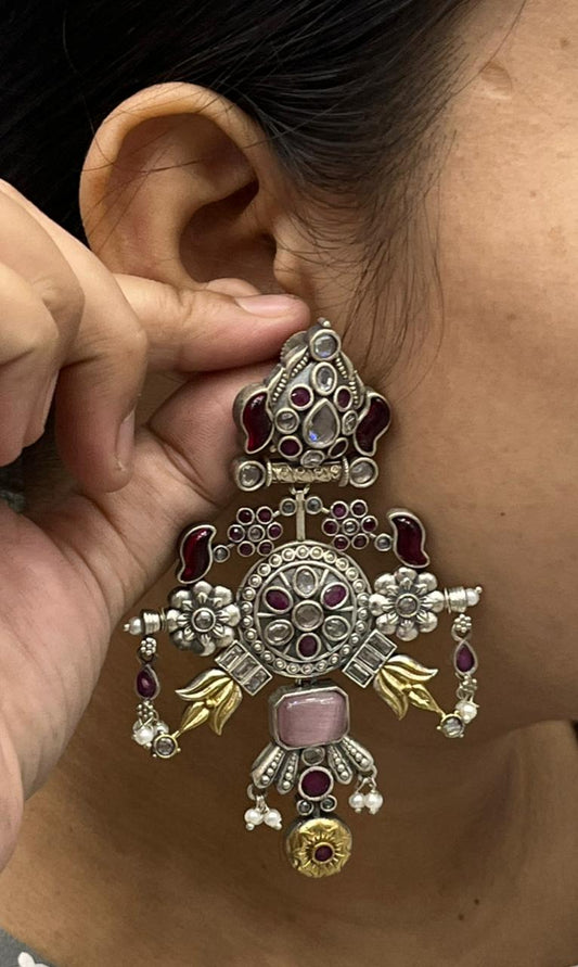 Oxidized Silver Long Earrings with Pink & Red Stones and Golden Stone