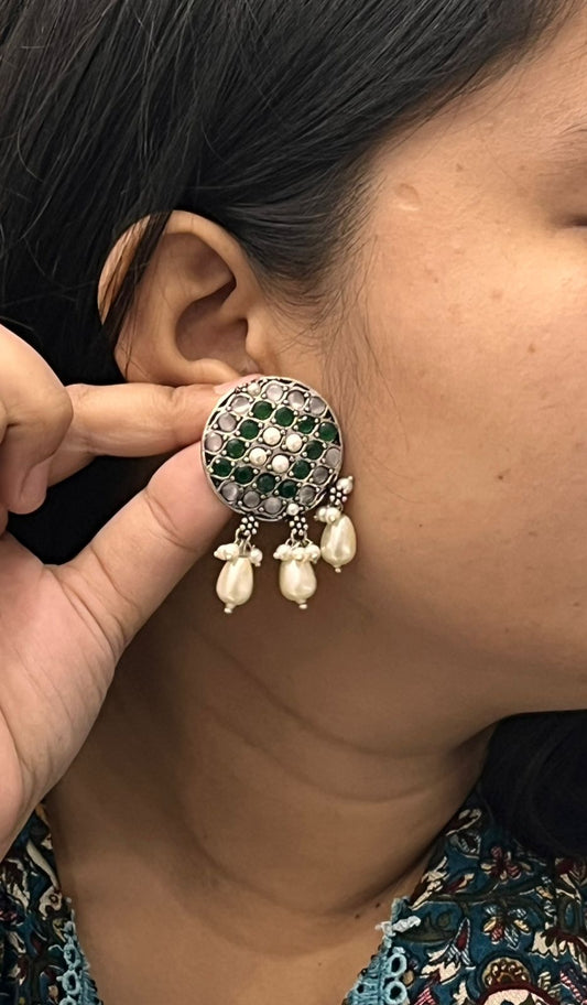 Green and Silver Round with Pearl Drops Earrings for women and girl