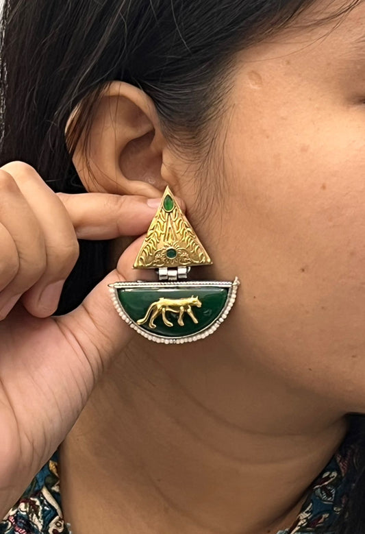 Green Stone & Gold Leopard Design with Beaded Detailing Earring