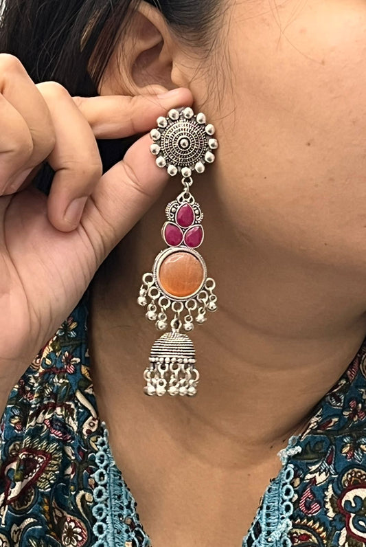 Ethnic Oxidized Silver Orange Stone & Pink Accent Long Earrings