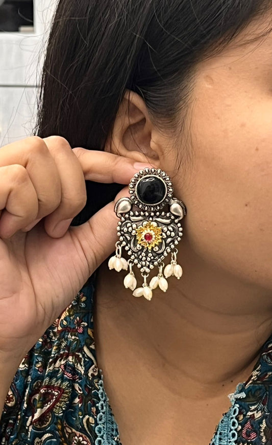Oxidized Silver Earrings with Black Stone & Pearl Drops