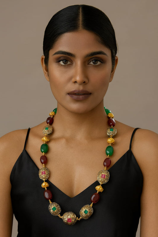 Antique Gold-Toned Beaded mala with Red & Green beads