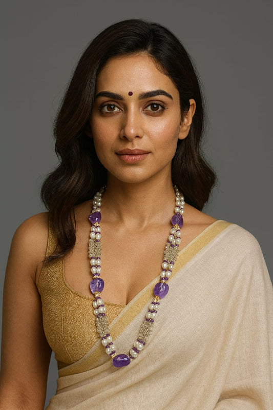 Elegant Royal Purple Beaded Pearl mala with Crystal Detailing
