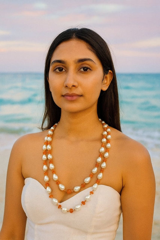 Ethnic White Pearl & Orange Bead Mala With Double Layer
