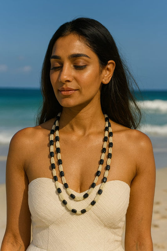 Elegant Handcrafted Black Onyx & White Beaded Double Layer Mala For Women