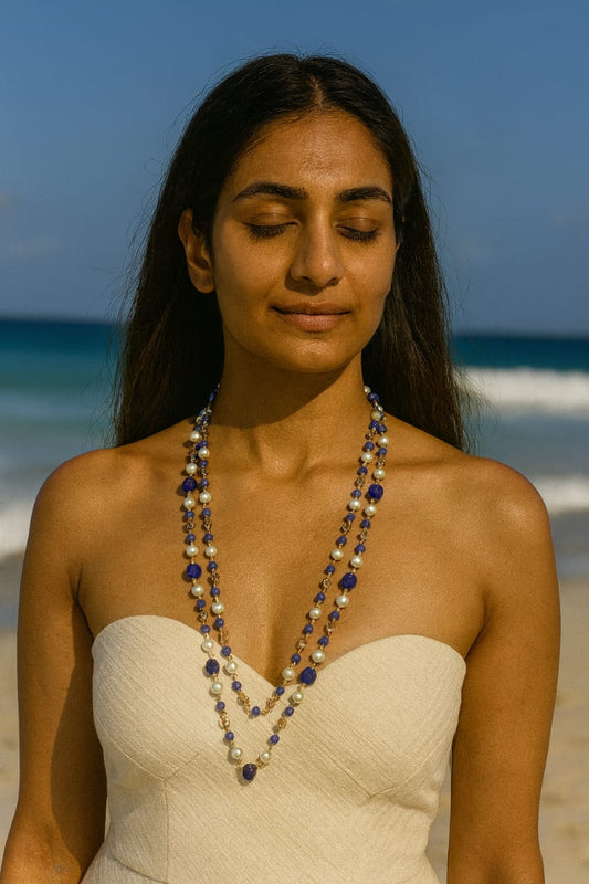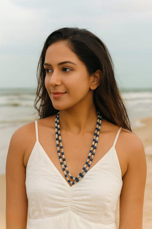 Elegant Long Two Layer Royal Blue Beaded & Pearl Mala For Women