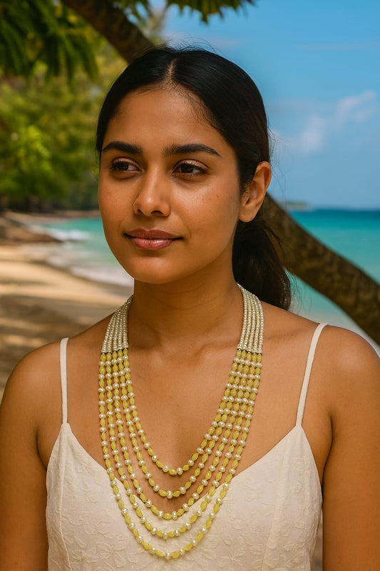 Elegant Long Mint Green Beaded & Pearl Five Layer Mala For Women