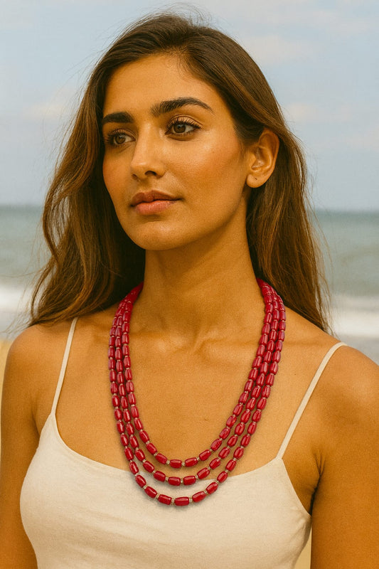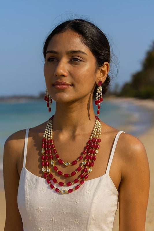 Handcrafted Red Beads & Pearl Mala with Earrings For Women