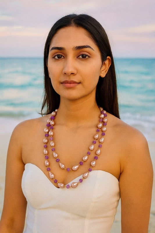Elegant Long Two Layer Royal Purple Beaded & Pearl Mala For Women