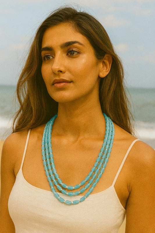 Elegant Three layer mala with bold Aqua Blue beads For Women
