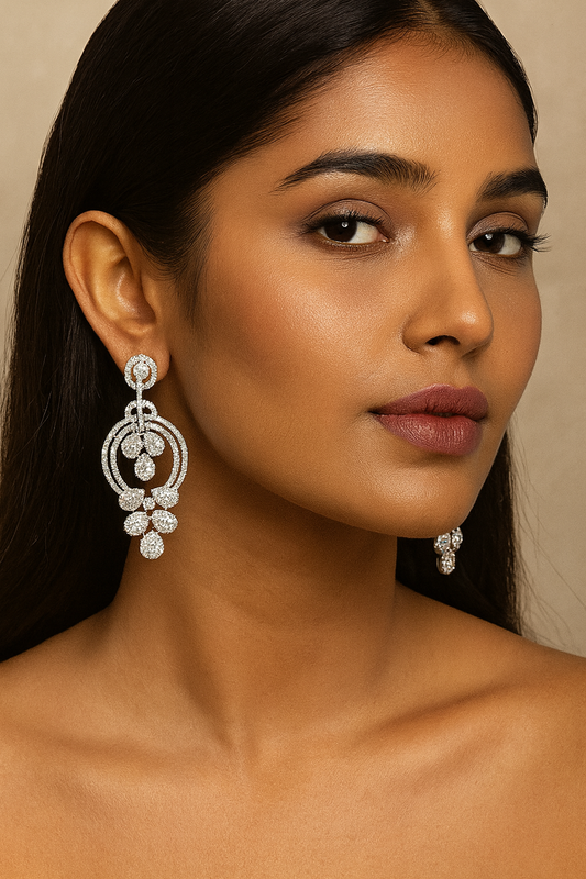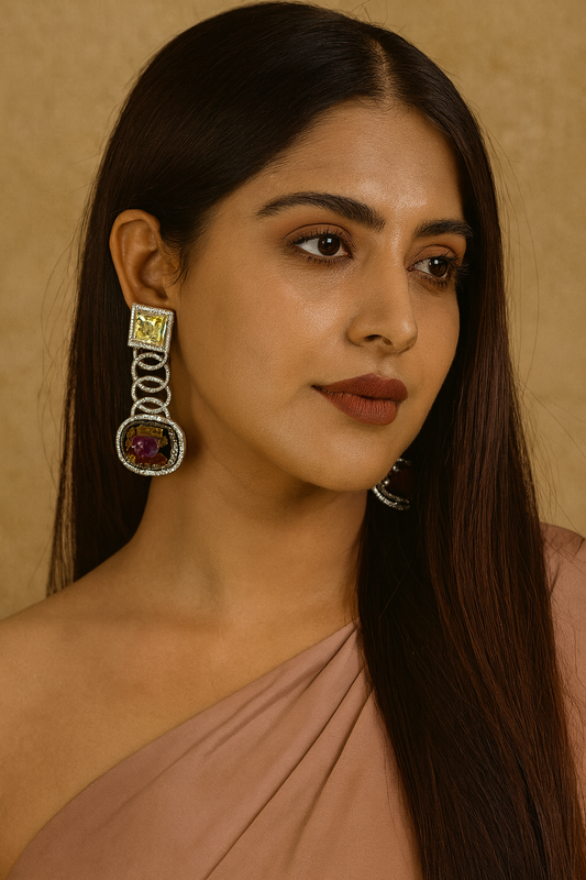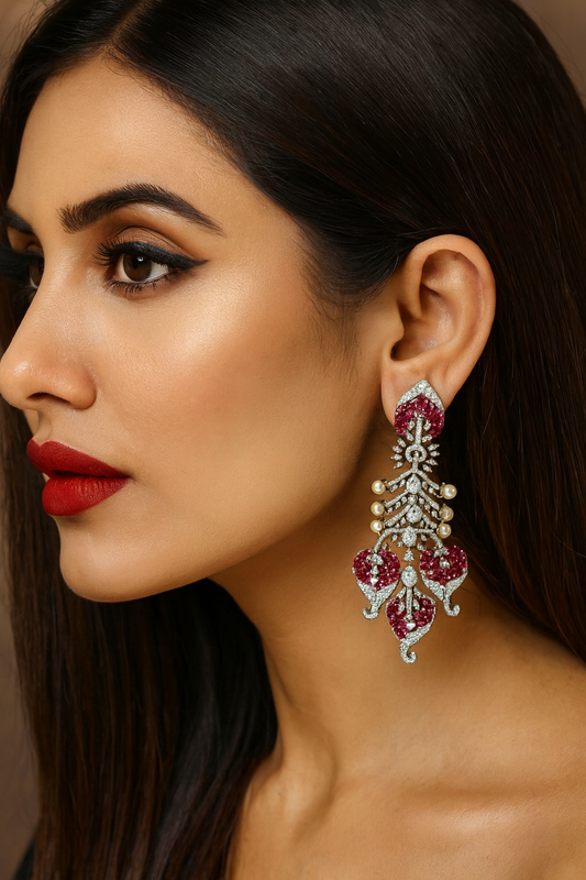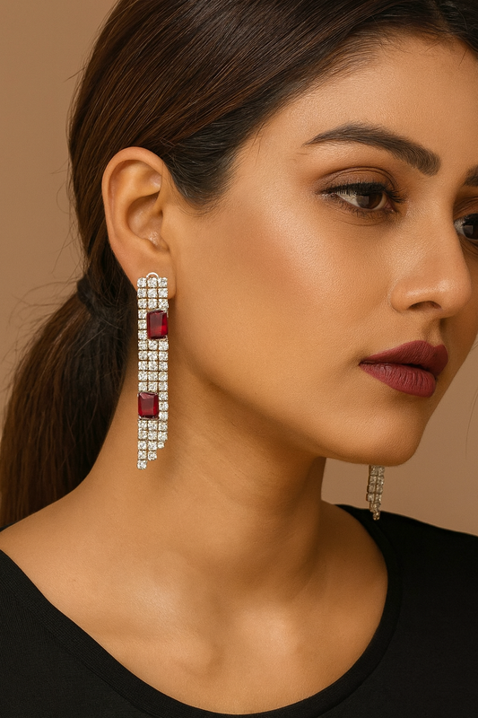 Ruby Red & Diamond CZ Long Dangler Earrings with Silver Polish