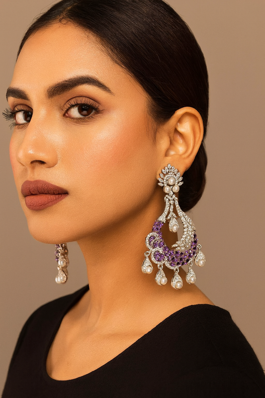 Glamorous Pearl Drop & Purple Zircon Long Earrings
