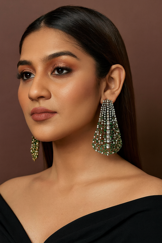 Elegant Green Teardrop and CZ Long Statement Earrings