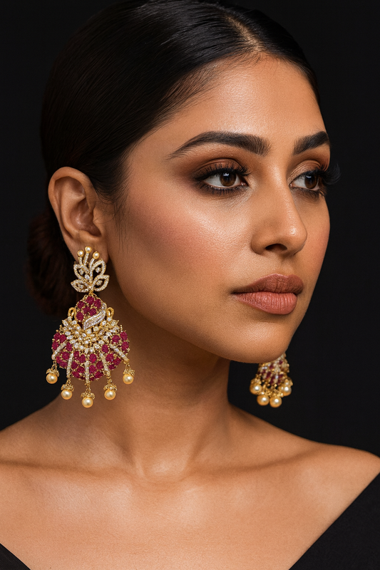 Elegant Long Earrings with Red Stones, Pearls & Gold Crystals