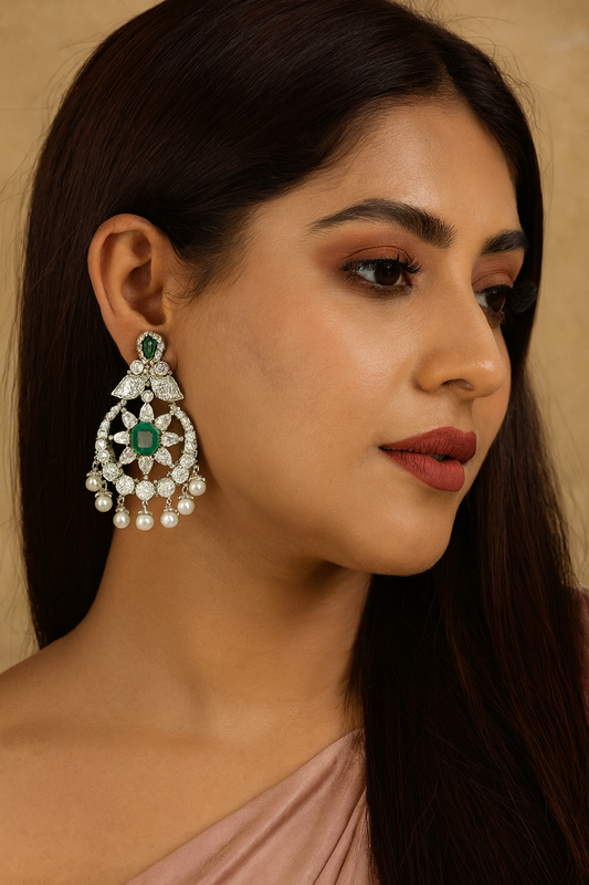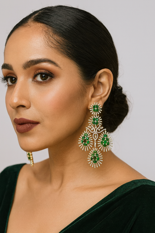Emerald Green & CZ Stone Chandelier Earrings with Pearls