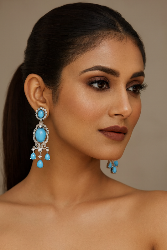 Elegant Long Earrings Aqua Stone & Crystal Drop Earrings