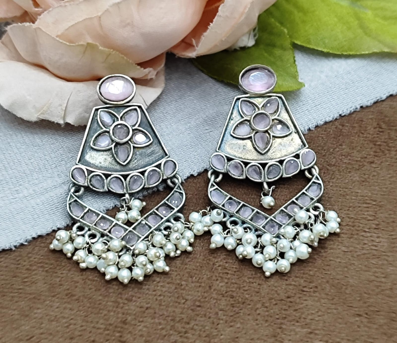 Antique Oxidized Statement with Pink Stone Floral Design & Pearl Danglers Earrings