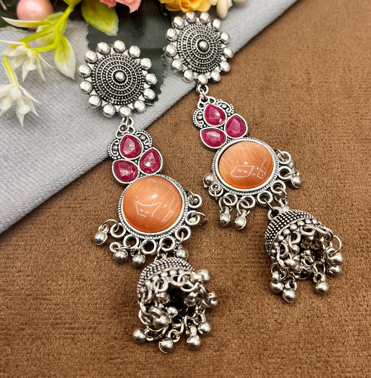 Ethnic Oxidized Silver Orange Stone & Pink Accent Long Earrings