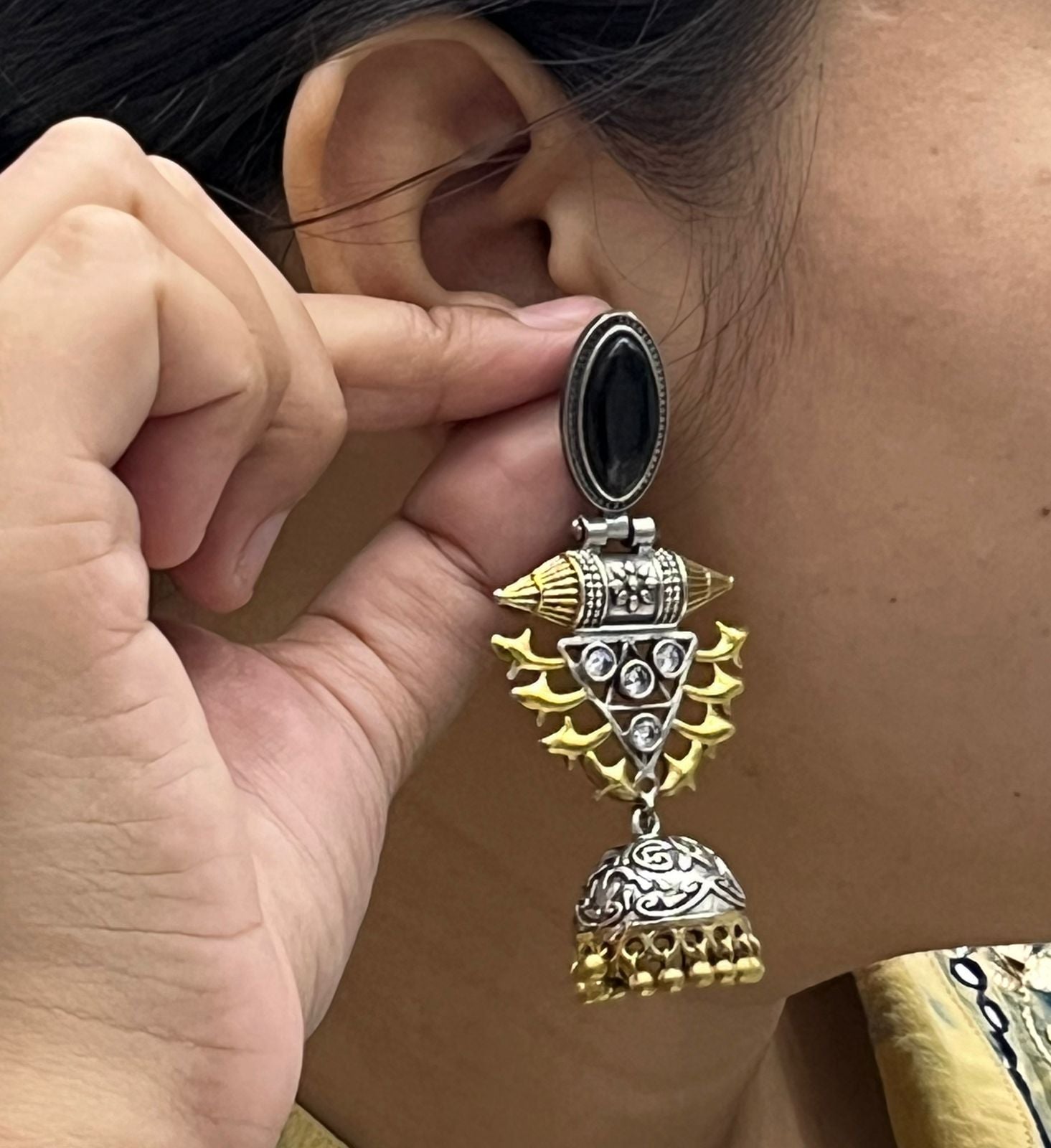 Oxidized Silver Jhumka Earrings with Black Stone & Golden Detailing